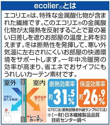 ●ecolier(エコリエ)とは/エコリエは、特殊な金属酸化物が含まれた繊維です。このエコリエの金属酸化物が太陽熱を反射することで夏の暑い日差しを遮りお部屋の温度上昇を抑えます。冬は断熱性を発揮して、寒い外気温に左右されにくいお部屋の快適環境をサポートします。一年中冷暖房の効率が高まり、省エネでおサイフにもうれしいカーテン素材です。[断熱効果率]約31.5%[保温効果率]約26.9% QTEC法(断熱試験赤外線ランプ60℃法)※(一財)日本繊維製品品質技術センター調べ