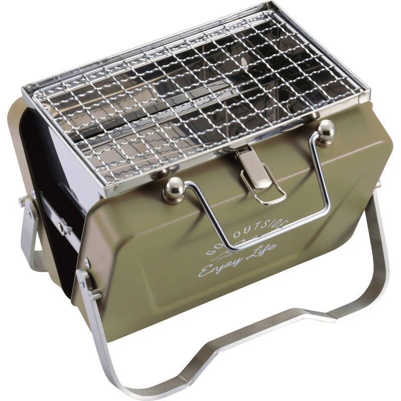 ソロキャンプや行楽に最適なコンパクトサイズのV型卓上グリル。煮炊きができるゴトク付き。
